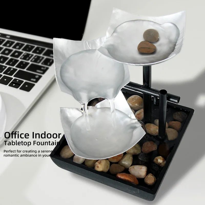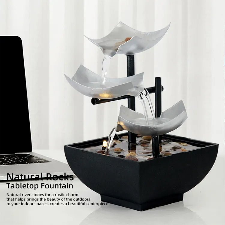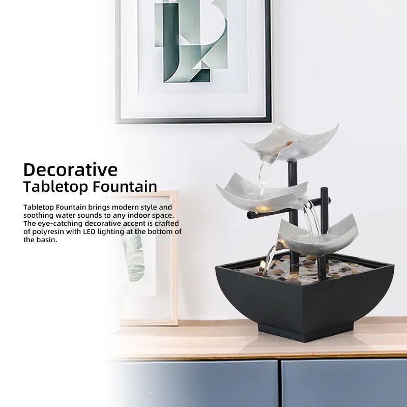 The fountain has three levels that are filled with water. creating a mini waterfall that flows smoothly from level to level. producing a relaxing sound of running water. In addition. this fountain also has integrated LED lights that illuminate the waterfall. creating an impressive visual effect that complements the relaxing atmosphere.