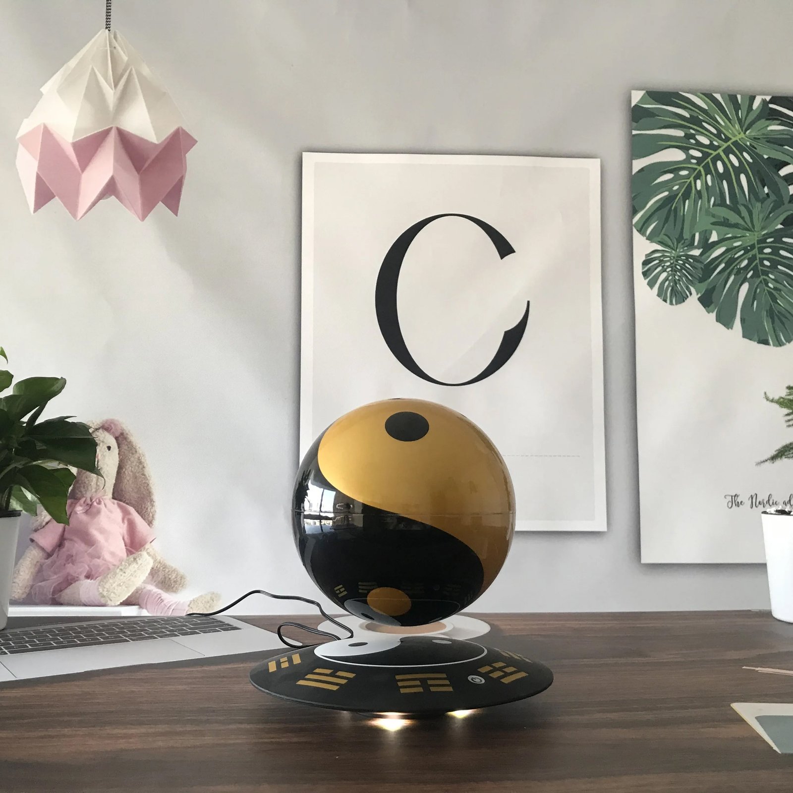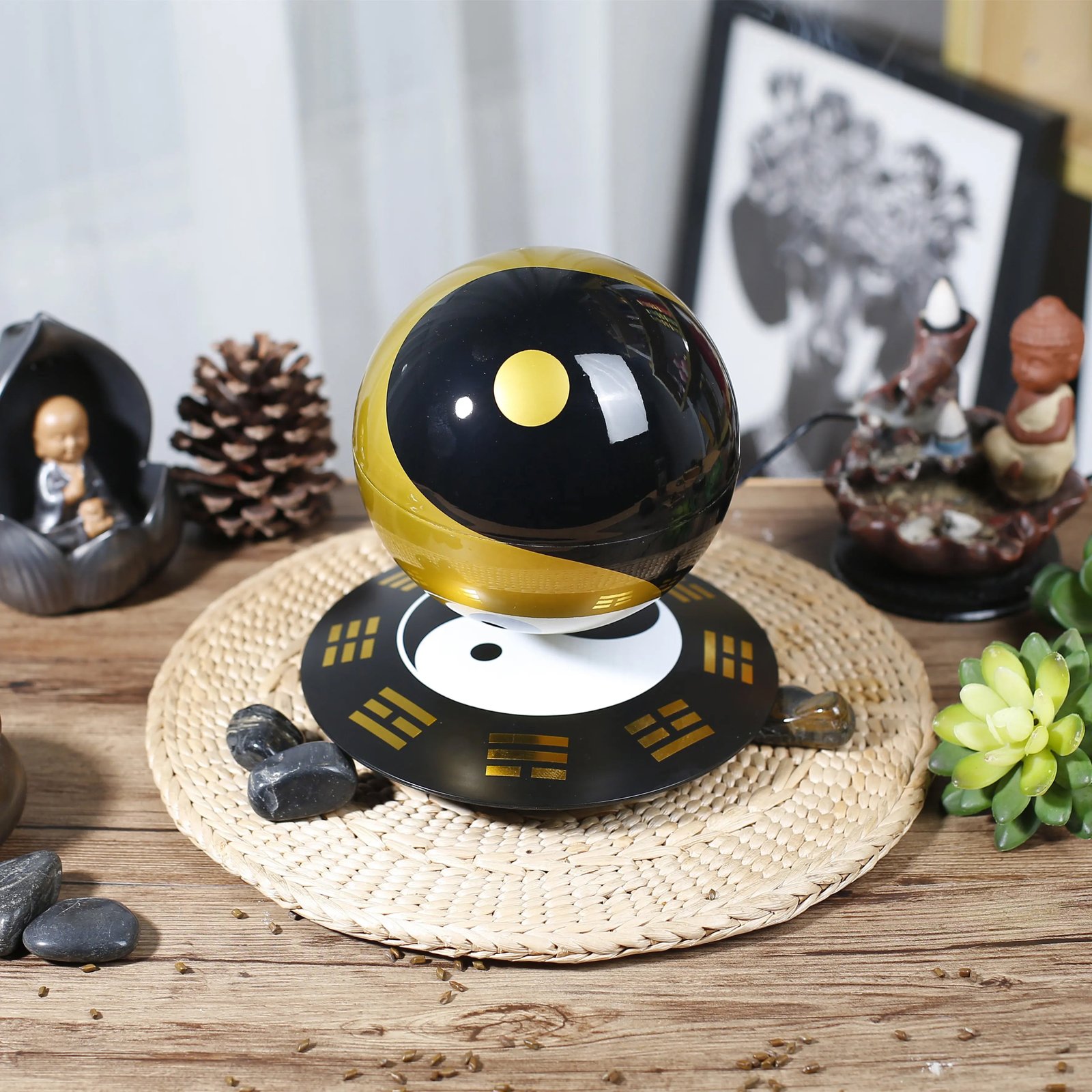 With its design inspired by vintage aesthetics and the mysteries of Feng Shui. this sphere is more than a simple decoration; it is a talisman of balance and serenity. Equipped with an illuminated base. the Tai Chi Zen Sphere radiates subtle light. enhancing its floating beauty and adding a touch of magic to your home or workspace.